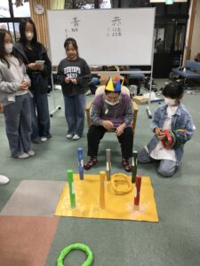 様々な色に分かれた輪を同じ色のピンに向かって輪投げをします。同じ色に入れば2点、違う色でも1点、総得点をチーム戦で競うゲームです。