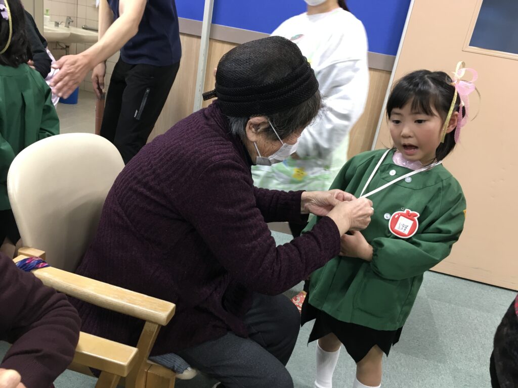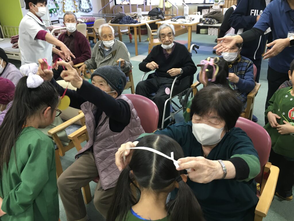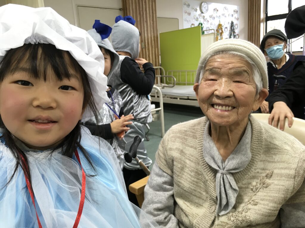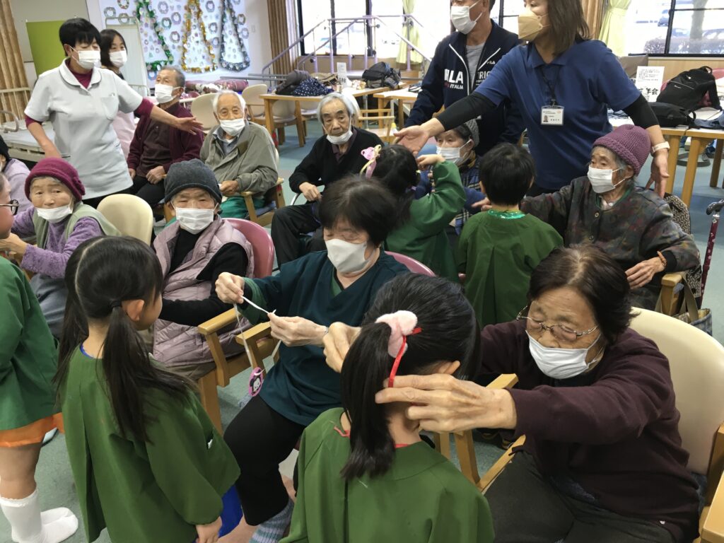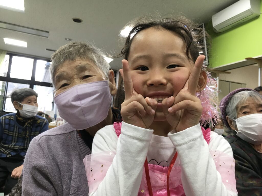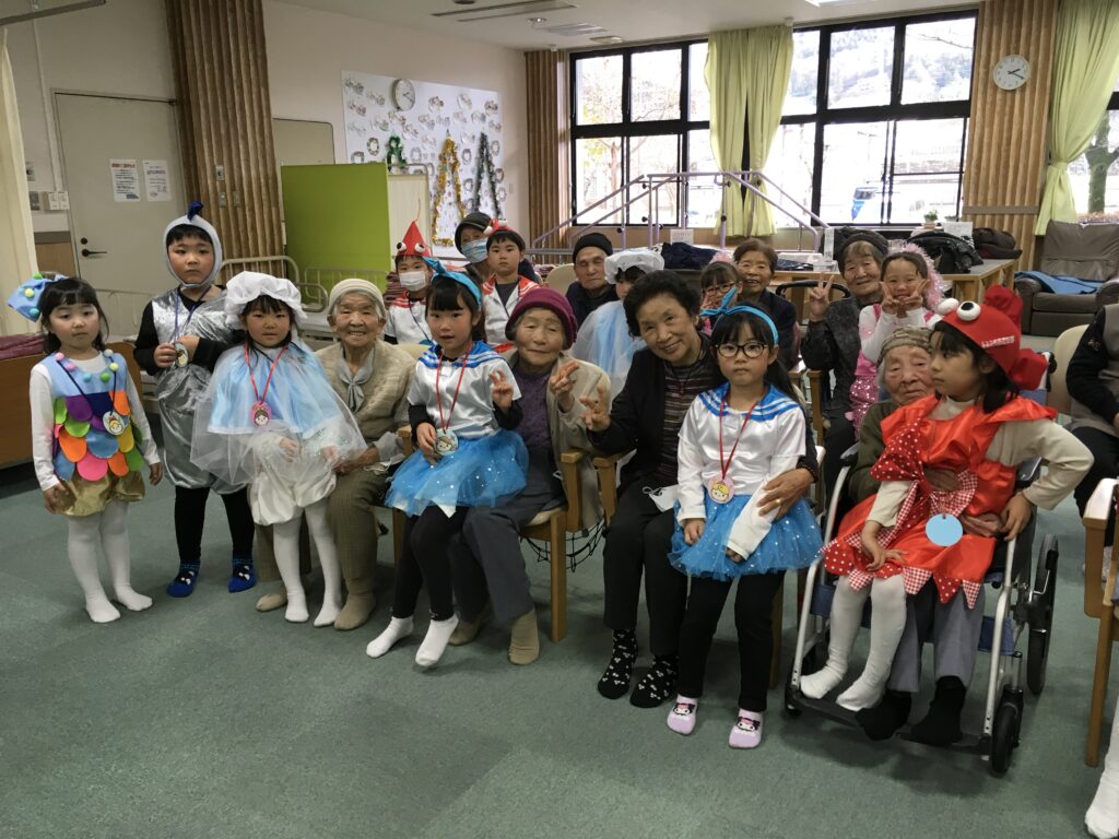 1日目は子育保育園の園児達が慰問に来てくれました。23名の大人数の園児達が手作りの衣装に着替えて遊戯や大きな声で歌を歌ってくれました。利用者様からは「やっぱり子供は元気だね。こっちまで元気になるよ。」「可愛いね。本当に可愛い❗」「あれがウチの孫だよ。」と皆様が大変、喜んで下さいました。