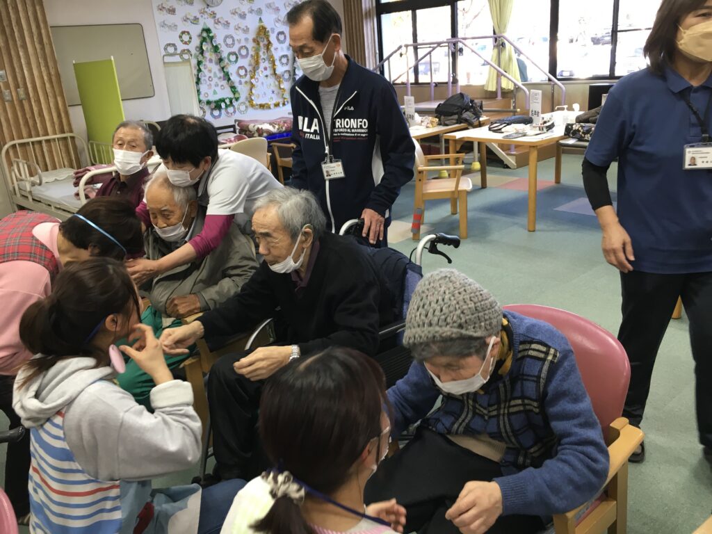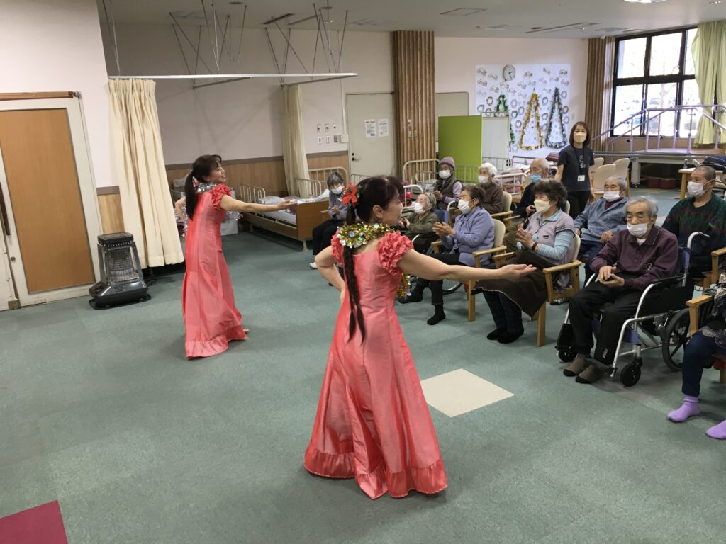 3日目は、谷間のユリ(フラダンス)の慰問でした。「谷間のユリの方々です。」と紹介すると利用者の皆さんが「去年も来てくれましたよね。ありがとうございます。」「華やかだね。すごい!!綺麗✨」「フラダンスを見ることが無いから来て良かったね。ラッキー!!」「どんな踊りをするのか楽しみ♬♬」などフロアー内がざわめいていました。1曲1曲踊りが終わるごとに「わあ~、すごーい!!」と盛大な拍手が沸いていました。