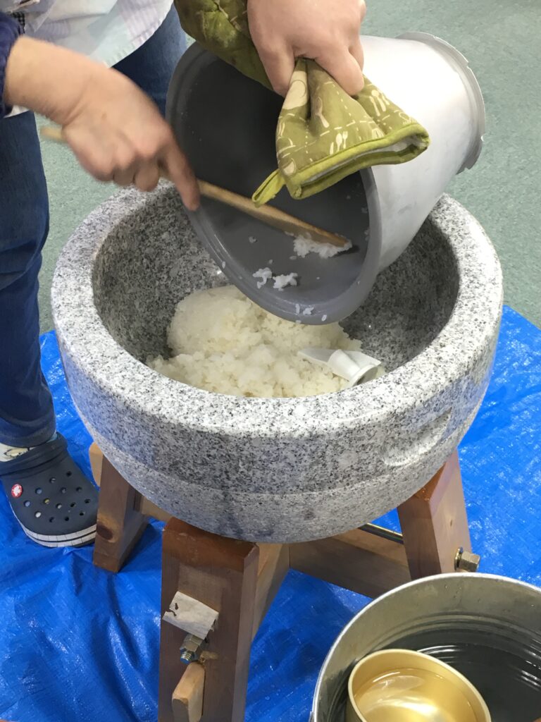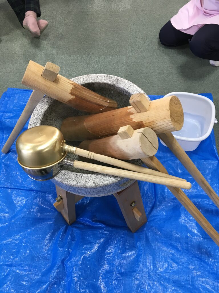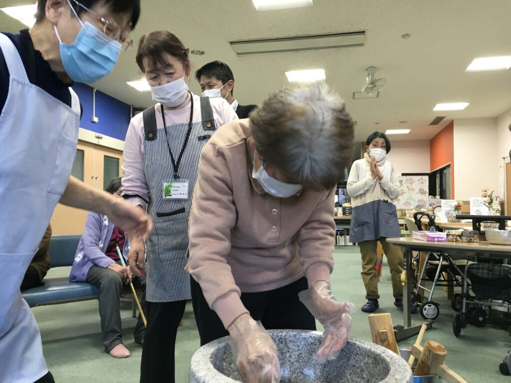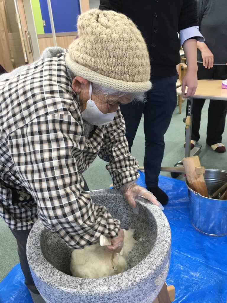 利用者様にも、杵を持ってついて頂いたり、お餅を返して頂いたりして、昔取った杵柄で大活躍でした。