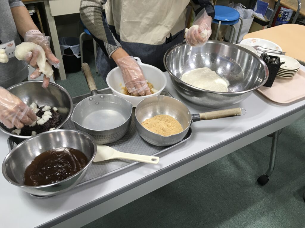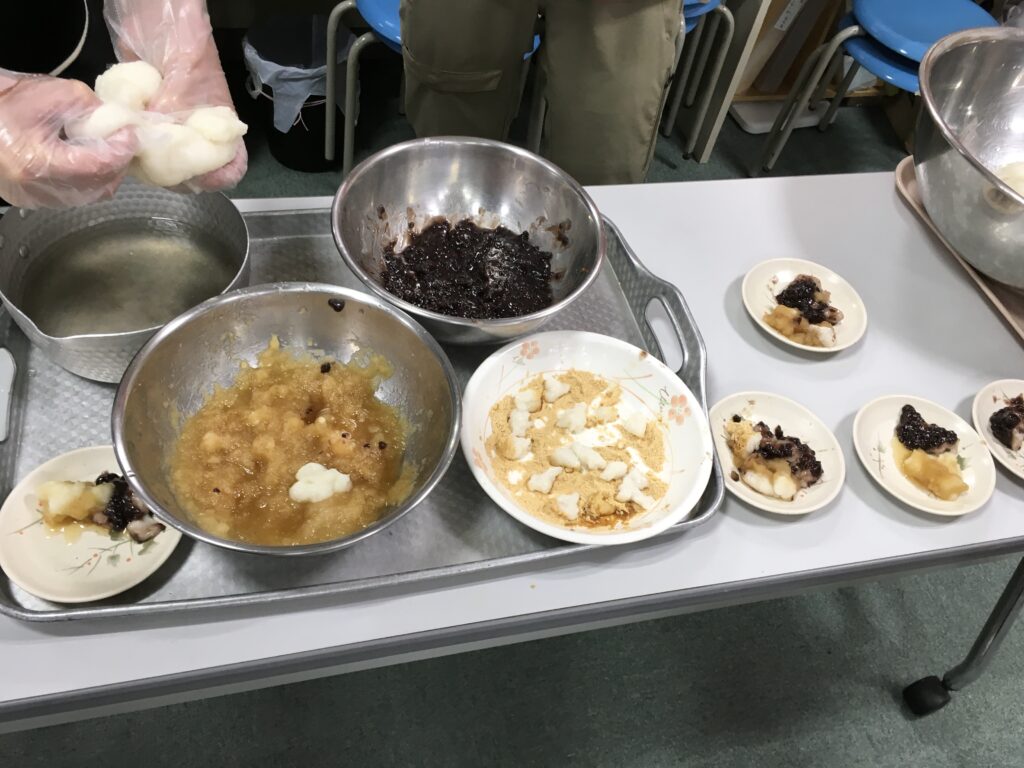 お餅をついた後は、からみ餅、あんこ餅、きな粉餅、みたらし餅にして頂きました。