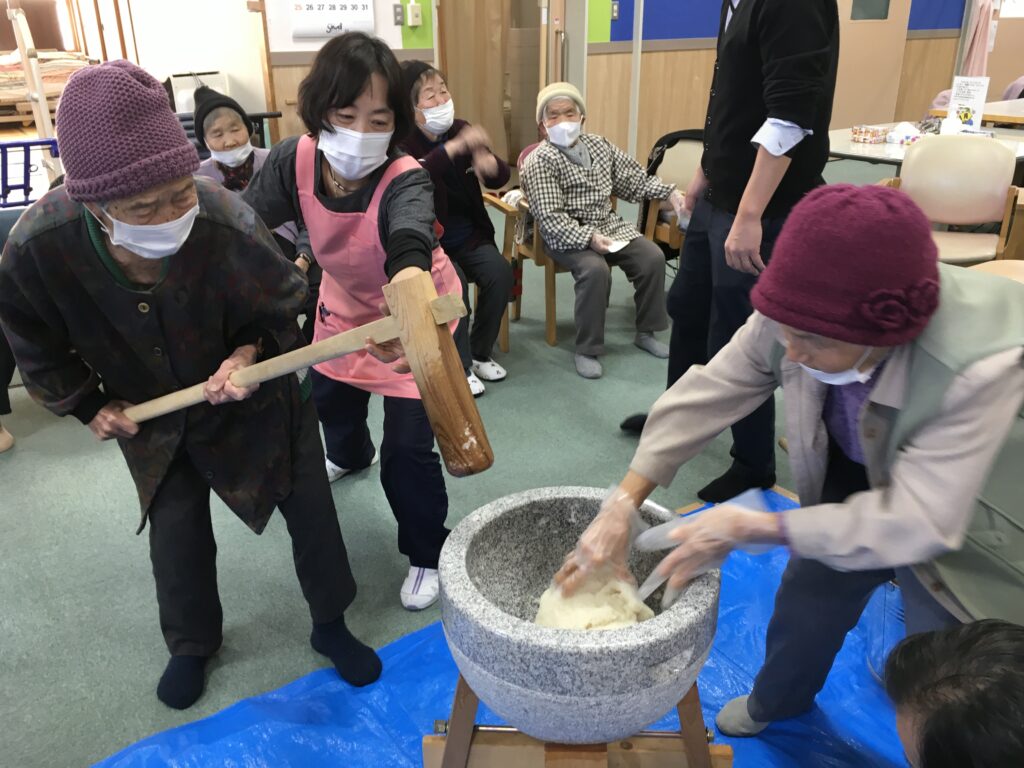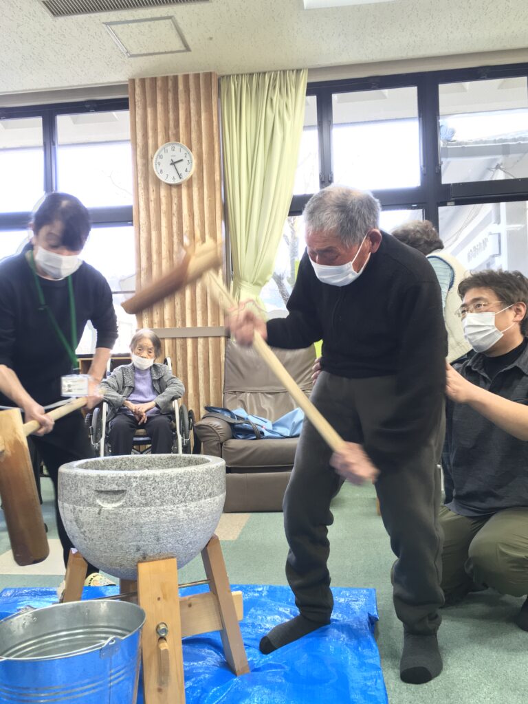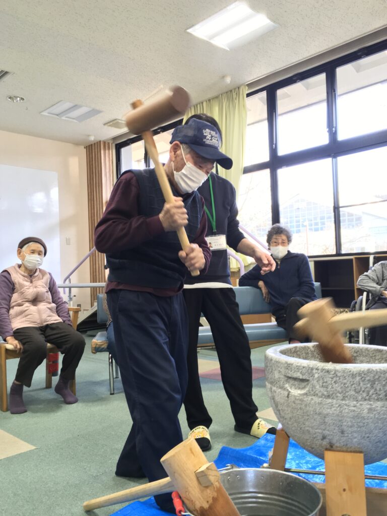昭和村デイサービスでは餅つきは、利用者様に昔を思い出し懐かしむことで、楽しみを一つでも増やして頂くことを目的に行いました。今後も、楽しみを持って生活して頂けるように取り組んでいきたいと思います。